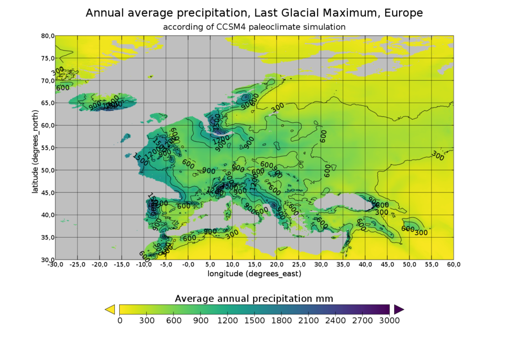 Guthrie argued that clear skies were more critical than precipitation in producing aridity, but realistically, areas receiving 500 mm or more of precipitation (see map above) under a cold climate will have plenty of cloudy days anyway. To be fair, most of his research centered on Beringia where glacials were indeed quite dry. However, different explanations are evidently needed for wetter regions of the mammoth steppe, like Europe. Although it is possible that paleoclimate simulations underestimate aridity in LGM Europe, nearly all models fail to reproduce the degree of aridity and treeless-ness indicated by pollen analysis, indicating that factors beyond climate may be at play.