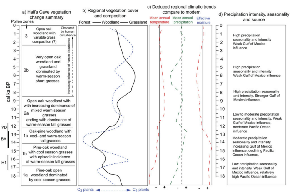 A 2020 study “Rapid range shifts and megafaunal extinctions associated with late Pleistocene climate change” examined fossil plant and animal remains from Hall’s Cave in the Edwards plateau of Texas to analyze paleoecological dynamics between the Last Glacial Maximum and early Holocene5, an interval which includes the window for megafaunal extinctions in North America. The study found dramatic shifts in flora and fauna in response to temperature and moisture changes. More significantly, it revealed that megafaunal and small animal diversity thrived during the Last Glacial Maximum (LGM) as well as the warm interstadial period known as the Bølling–Allerød (BA), but then declined markedly during the Younger Dryas (YD). The Early Holocene featured a partial recovery of plant diversity but the megafauna were absent. The study concludes that rapid cooling associated with the Younger Dryas as well as human pressure were causal agents of extinction in the region.