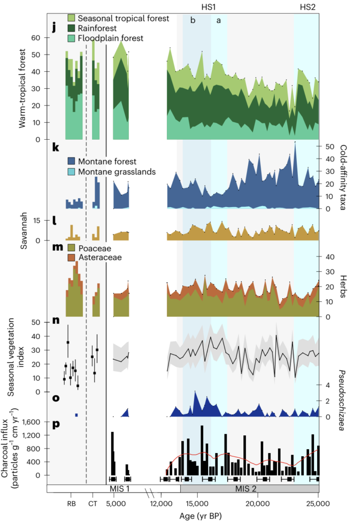 The drop in wet season rainfall combined with stability or increase in dry season rainfall meant that although the total balance of water in the Amazon ecosystem was lower (hence the lower lake/river levels), this was not felt that sharply by the plants. I’d personally speculate that the lack of major fire activity during the LGM can be explained not just by lower temperatures, but also a lack of pronounced dry seasons (since those are when fires are most likely to occur). Ultimately, there was no drastic biome shift.